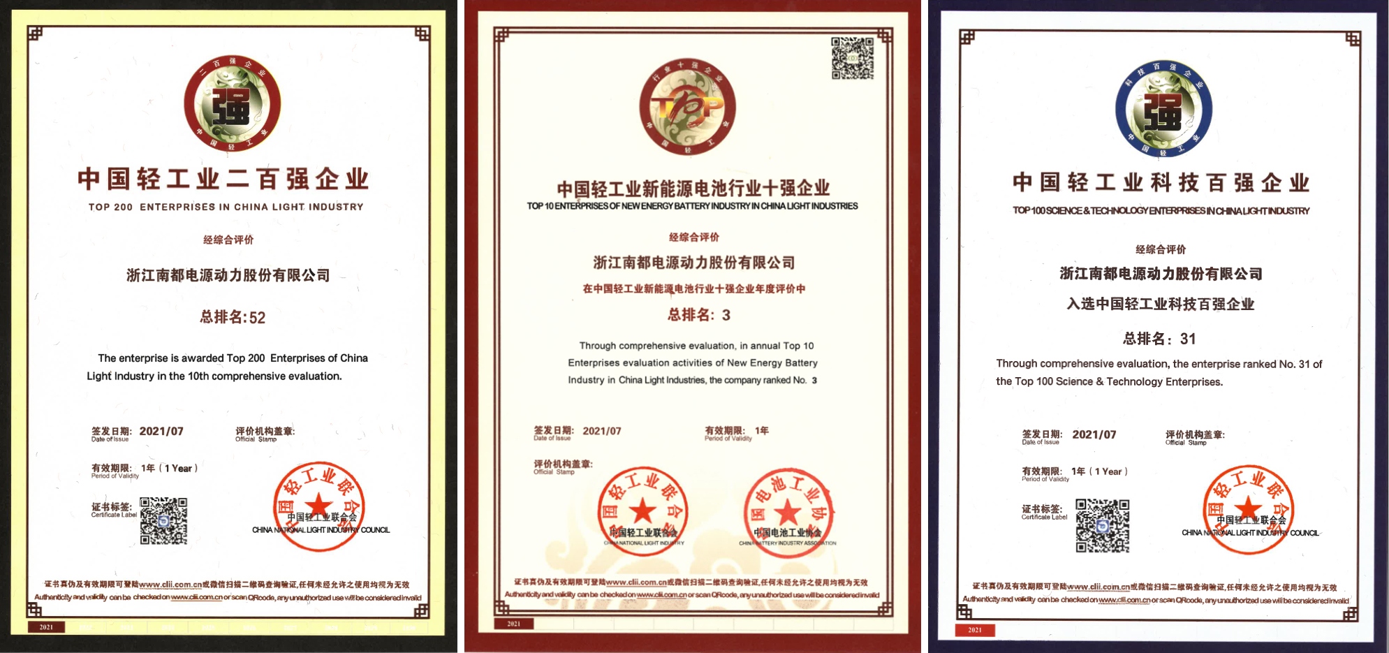 日前,中国轻工业团结会宣布了 2020 年度中国轻工业二百强企业榜单,优德官方网站w88再次入选,位列第 52 位,同时公司还荣获了中国轻工业科技百强榜第 31 位和中国轻工业新能源电池行业十强榜第 3 位。这也是“中国轻工业百强企业”自 2011 年宣布以来,优德官方网站w88一连十年上榜。